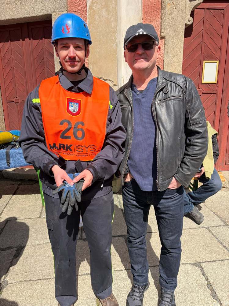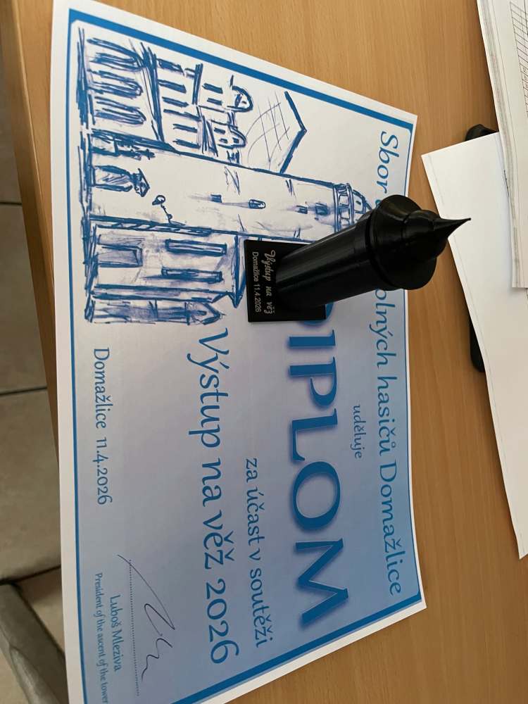 Sbor dobrovolných hasičů Domažlice pořádal v sobotu 11.4.2026 Výstup na věž. Jedná se o soutěž s více než dvacetiletou tradicí. Vítězí ten, kdo nejrychleji dokáže vynést na vrchol domažlické věže dýchací přístroj a požární hadici typu C, a to vše v pracovním hasičském obleku, v kanadách, přilbě a rukavicích. Borci z našeho sboru Aleš Volkmann a Samuel Šoltés bojovali statečně. V těžké konkurenci obsadili 20.místo s časem 113,4 sec a 27.místo s časem 154,2 sec. Ze soutěže si kromě nových zkušeností odnesli také model domažlické věže a diplom. Děkujeme za vzornou reprezentaci sboru a těšíme se na další výkony našich mladých hasičů.